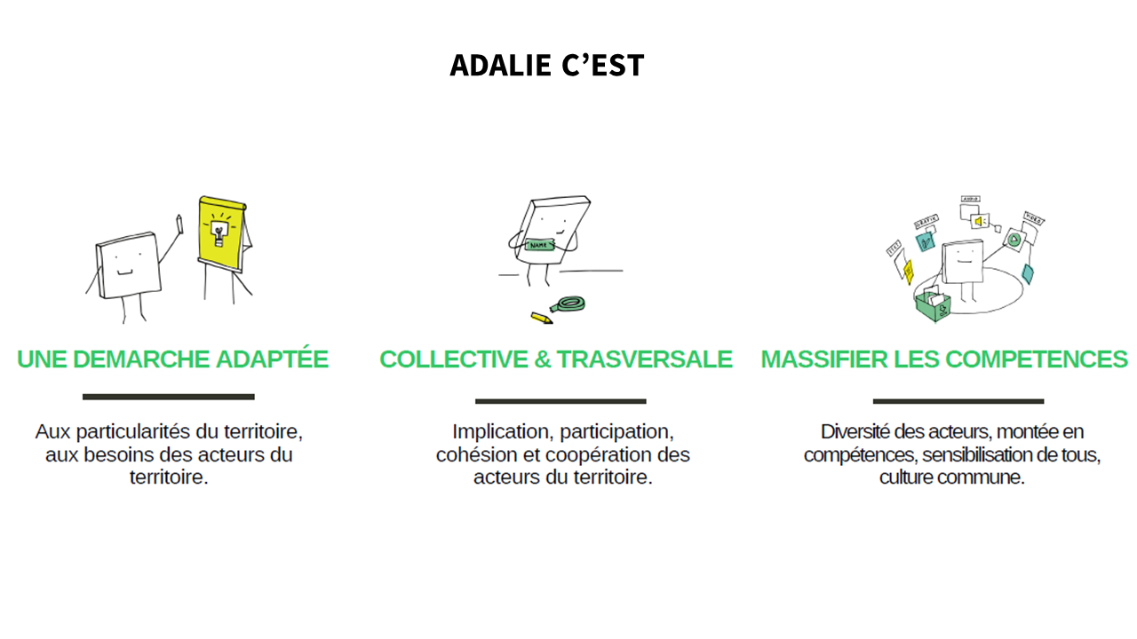 La démarche ADALIE® a vocation à s’adapter aux particularités de chaque région étudiée et à répondre aux besoins des acteurs. A la fois collective et transversale, elle repose sur l’implication, la participation, la cohésion et la coopération des acteurs régionaux tout au long de son déploiement. De plus, elle assure une massification des compétences par la diversité des acteurs, le développement des compétences, la sensibilisation de tous et l’apport d’une culture commune.